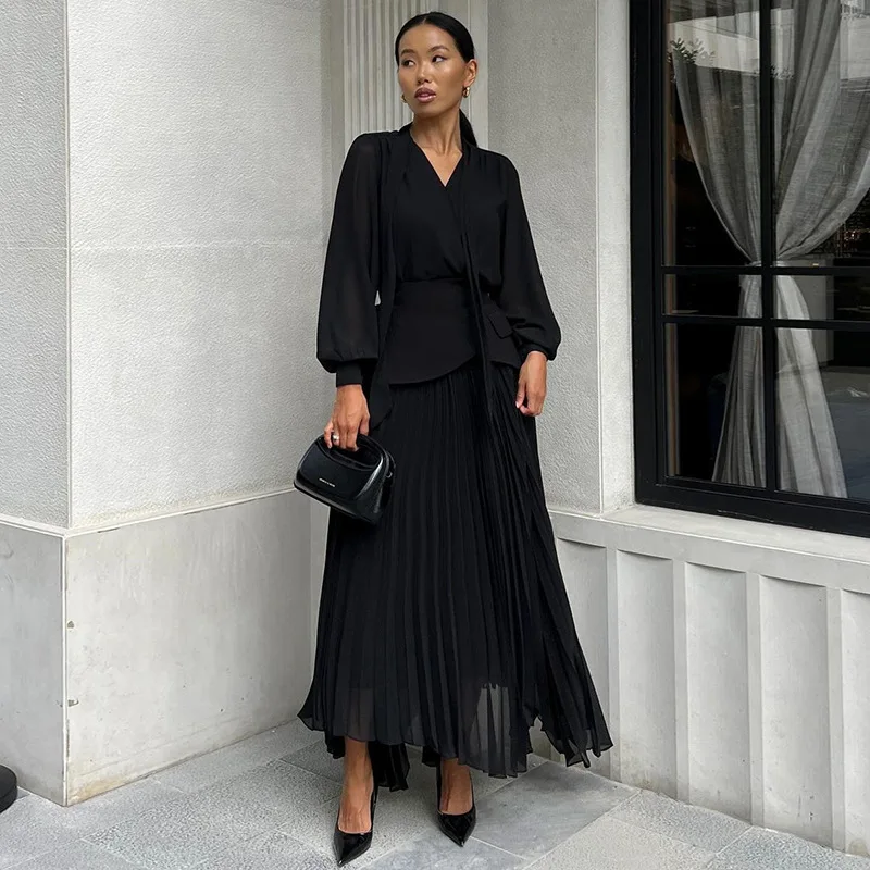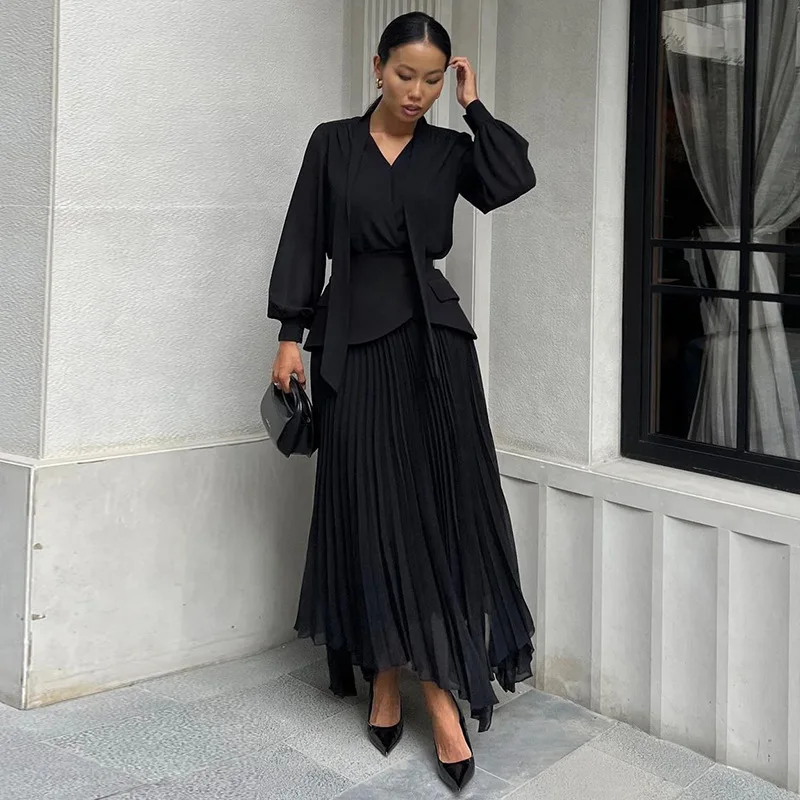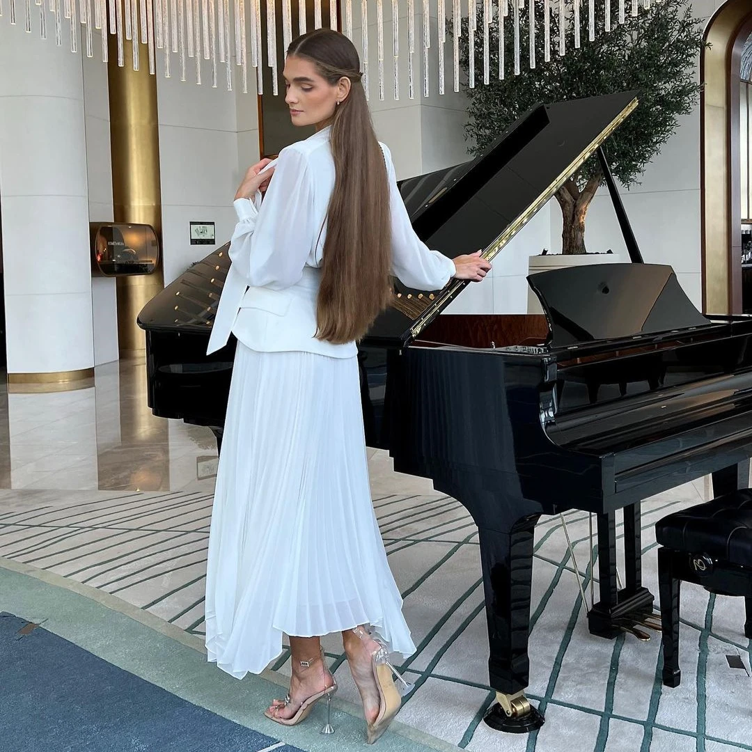 Elegant White Irregularity V Neck Full Sleeve Tops Lace up Pleated a Line Long Skirts Suit Women Dress Sets Skirt Two Piece Sets